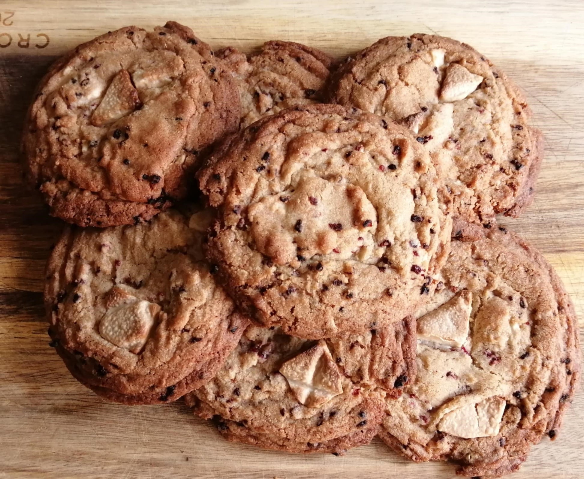 These delightfully crisp and chewy cookies are filled throughout with wonderful white chocolate and pieces of freeze dried raspberries. This cookie can either bought as a set of 12, or as a set of 6 mixed and matched with 1 other cookie flavour.